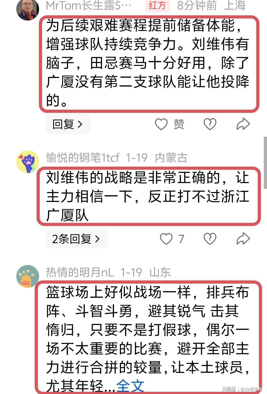 不过,也有网友持不同意见,认为“为后续艰难赛程提前储备体能,增强球队持续竞争力。刘维伟有脑子,田忌赛马十分好用,除了广厦没有第二支球队能让他投降的。”;“刘维伟的战略是非常正确的,让主力相信一下,反正打不过浙江广厦队”;“篮球场上好似战场一样,排兵布阵、斗智斗勇,避其锐气 击其惰归,偶尔一场不太重要的比赛,避开全部主力进行合拼的较量,让本土球员,尤其年轻的队员都上场打打比赛也是一种挑战和尝试。”……