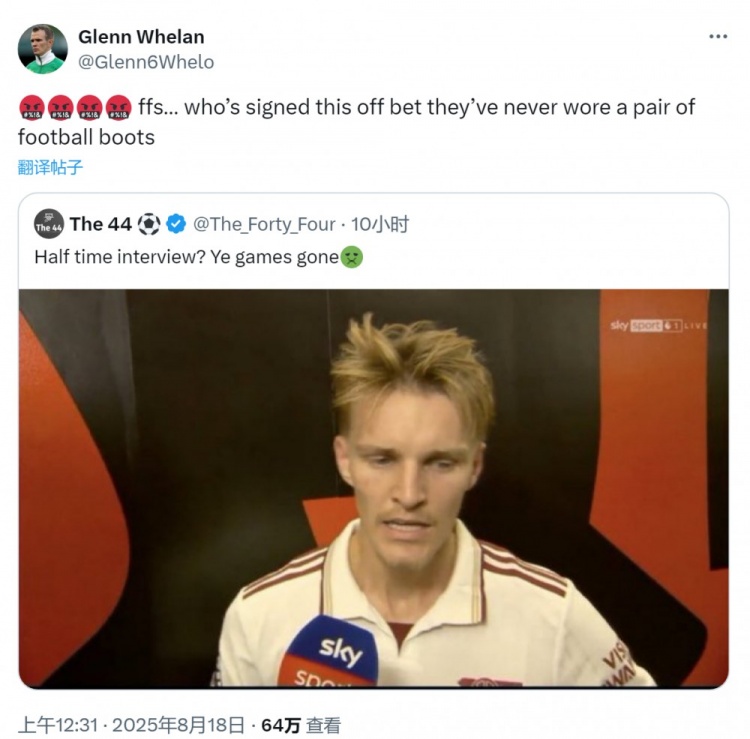 惠兰社媒转发厄德高中场休息接受采访的照片,并写道:“X的,这谁签的字(批准中场休息采访),我敢打赌他们从没穿过球鞋。”